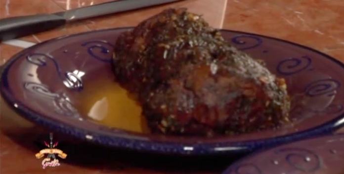 • Tie with butcher string and roll in mixture of chopped garlic, sage, dill & thyme